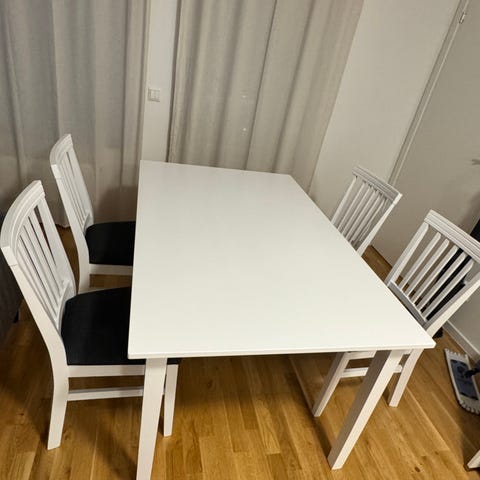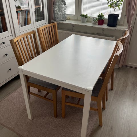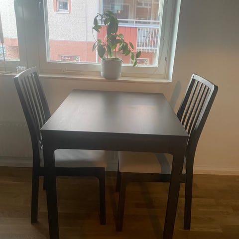 Matgrupp från IKEA med smart bord som går att förlänga. Anpassningsbar till 2 eller 4 matplatser. Bordsskivan förvaras inuti bordet när det är förkortat. Tillhörande stolar från samma serie (Ekenäset).