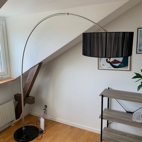 Stilren båglampa i krom med tung fot i grå sten. Perfekt att ha vid soffan som läs- eller mysbelysning.