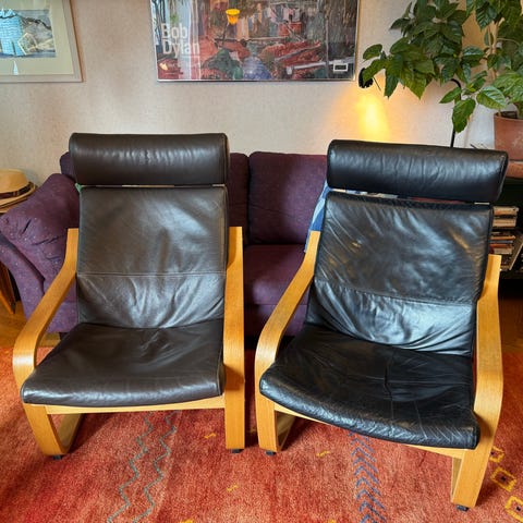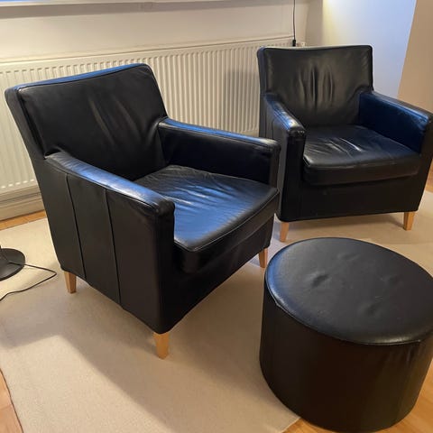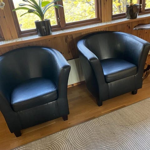 Mio fåtöljer i svart konstläder. Rundad, omfamnande form med lös sittdyna och markerade sömmar. Nypris 1900:- /st säljes för 500:-/st