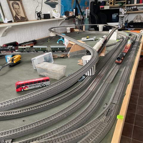hHusmodeller, träd, lyktstolpe och andra landskapselement för uppbyggnad av en modelljärnvägsmiljö. Det finns dessutom ett större antal rälsdelar, både raka och böjda spår, växlar samt elektriska komponenter och styrpaneler med knappar och kablar för manövrering av spår och signaler. Lämpligt som grund eller komplement till befintlig modelljärnväg.