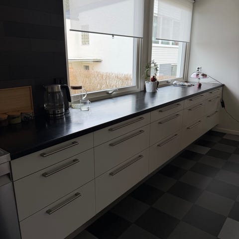Komplett kök till salu. Oljad bänkskiva, svarta luckor och mässingshandtag. Cirka 3 meter långt på varje sida. Vitvaror ingår ej i priset, men kan köpas separat (mycket bra skick).