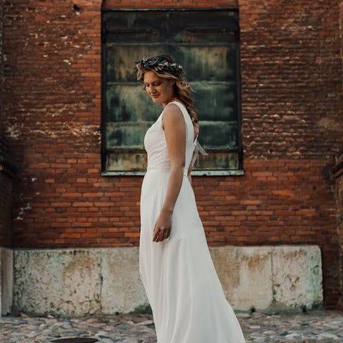 Enkel brudklänning i två delar, kjol + topp som knyts i ryggen. Av LoLi Design i Göteborg. Unik klänning, enda i sitt slag och endast använd vid ett bröllop.
