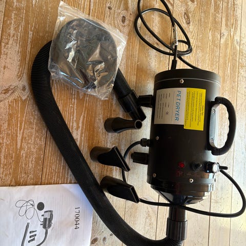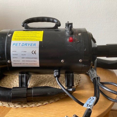 Canem Pets STL-1902 hundfön i blå färg. Elektrisk pälsfön för husdjur med justerbar luftstyrka och separat knapp för värme. Modellen drivs med 220 V och har en maxeffekt på 2400 W. Levereras med flexibel slang och flera munstycken för olika typer av päls och torkningsbehov. Passar för torkning och vård av hundar och andra husdjur efter bad eller utevistelse. Mycket effektiv. Endast använd vid två tillfällen så i nyskick.