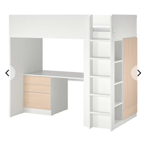 Eden 4 loftsäng för barn/ungdom med integrerat skrivbord, garderob och lådförvaring. Sängen är upphöjd med liggyta ovanpå och har säkerhetssarg runt bädden. Under sängen finns arbetsyta med skrivbordsskiva samt skåp och lådor för förvaring. På sidan finns garderob med dörrar och hyllutrymme. Trappan upp till sängen består av steg med inbyggda lådor och har räcke för extra stabilitet. Möbeln är i huvudsak vit med svarta fronter på skåp och lådor. Passar som platsbesparande lösning i barn- eller ungdomsrum. Finns i Haninge söder om Stockholm.