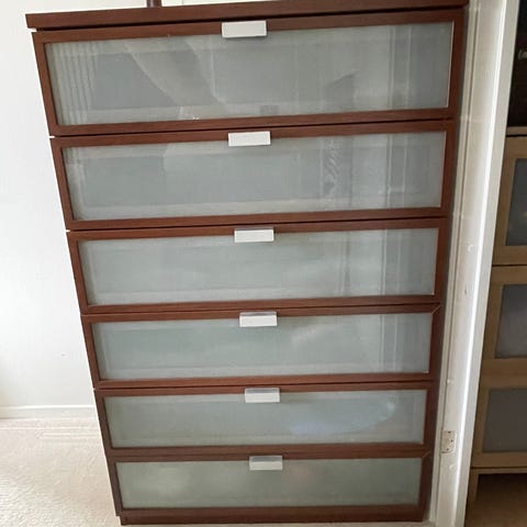 Byrå i ek. 6 låder. H125-B80-B48cm. Selges for kr 1000,-
