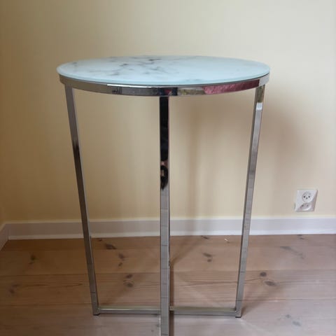 Stabilt och tungt bord. Vit botten med ljusgråa inslag.