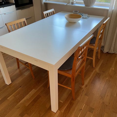 Matbord Dalarö från Mio och 6st tillhörande Dalarö stolar. Bordskivan och stolsitsen av massivt ek, annars vitlackerad trä.