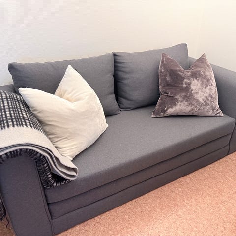 Bäddsoffa SKILLEBEKK mörkgrått tyg från Jysk i nyskick.