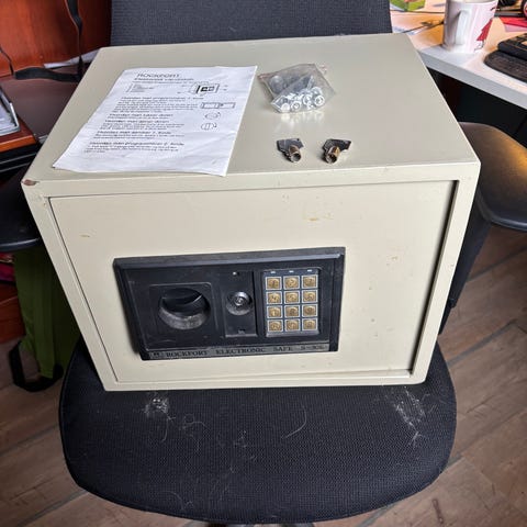 Safe värdeskåp i vitt utförande med elektroniskt kodlås på fronten och kraftigt handtag. Skåpet är avsett för förvaring av värdesaker, dokument och andra föremål som behöver skyddas mot obehörig åtkomst. Passar för användning i hem eller mindre kontor där man önskar en låsbar och robust förvaringslösning.