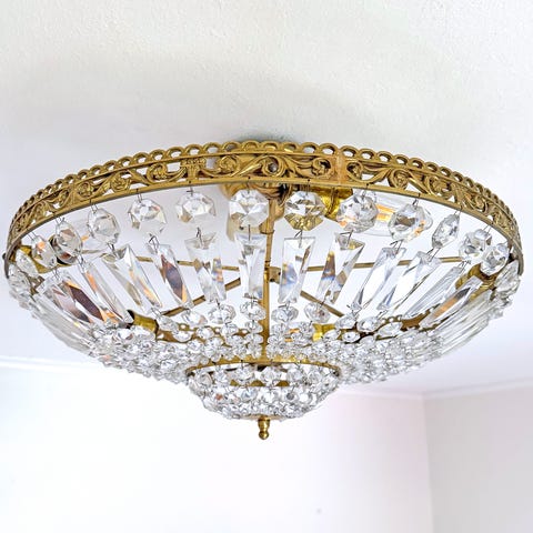 Studera bilder för skick, 1900-talets andra hälft så 60 - 70 år gammal och original från sin era. Perfekt för de som har lågt till tak då den är rätt limmad och de längst ner hängande kristallerna kan man knyta för att få det mer "UFO" format. Allt original och inget fattas.