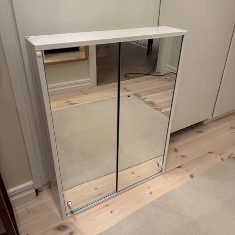 Spegelskåp för badrum med spegeldörrar och överliggande belysning. Skåpet har stomme i trä och invändiga hyllplan i glas.