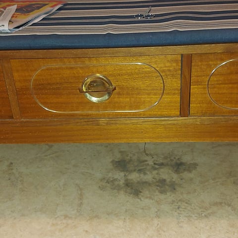En vit hallbyrå med lite färgsläpp som behöver målas i.3 stora lådor 2 små.