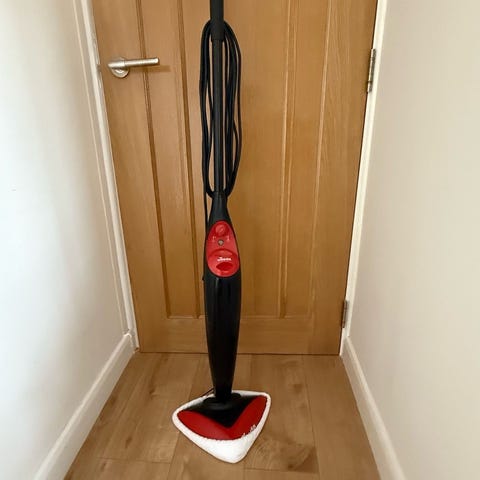 Laurastar ångstation i rosa med svart detaljering. Enheten har inbyggd vattenbehållare och ångslang med handtag och munstycke för ångning och strykning av textilier. Passar för användning i hemmet för att fräscha upp och släta ut kläder, gardiner och andra tyger med hjälp av ånga.