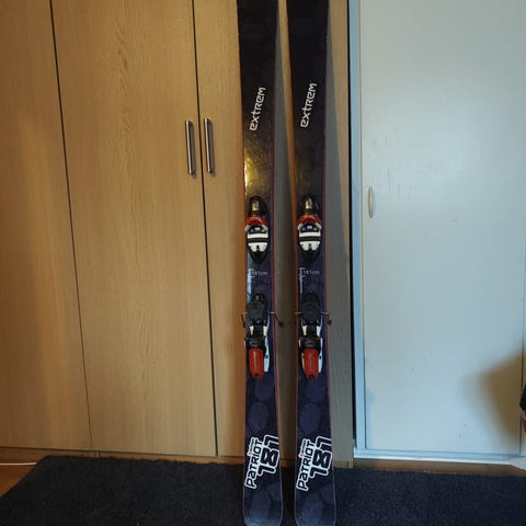 Bindningarna går att sätta i gåläge för toppturer. Undersidan visar tydligt slitage och repor i belaget, vilket kan behöva åtgärdas beroende på användningsområde. Lämpliga för pist och friåkning.