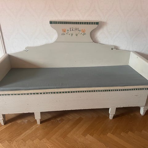 Gammal kökssoffa. Väl använd. Går att dra ut och bli en extra bädd. Lite färg behövs.