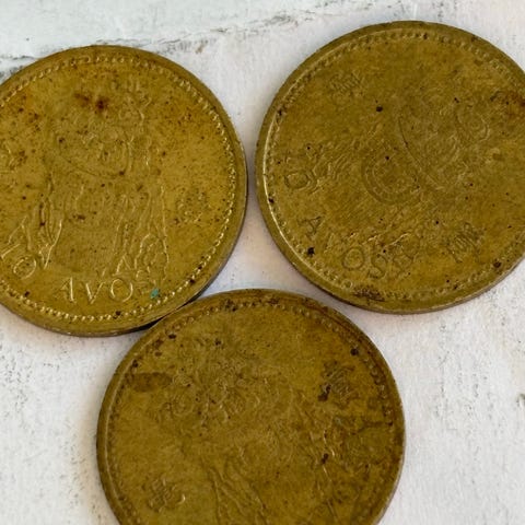 Hongkong mynt i blandade valörer. På bilderna syns bland annat 2 dollar, 1 dollar, 20 cent, 10 cent och 10 dollar samt 1 yuan från Kina