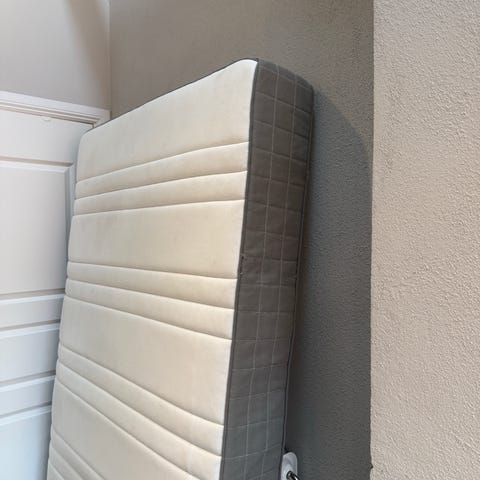 Jysk säng i grått tyg med träribbor i botten. Sängen har en rak, enkel design med textilklädd ram och ben som lyfter den från golvet. Passar som enkelsäng eller dubbelsäng beroende på mått, exempelvis i sovrum eller gästrum.