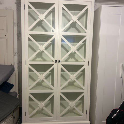 2.mindre skåp (samma höjd) med glas dörr med hyllor och förvaringsutrymmet.