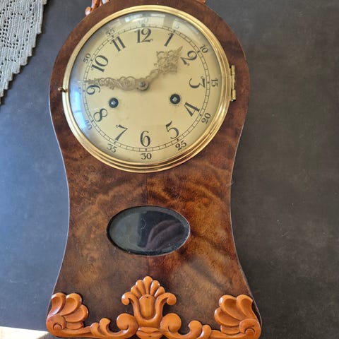 Gammal väggklocka. Har inte nyckeln så jag vet inte om den fungerar.
