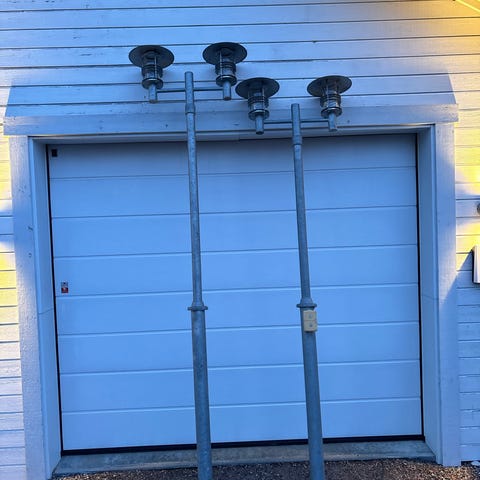 Två svarta lyktstolpar i aluminium, 195 sam 240 cm höjd. Väl fungerande. Finns i Saltsjöbaden