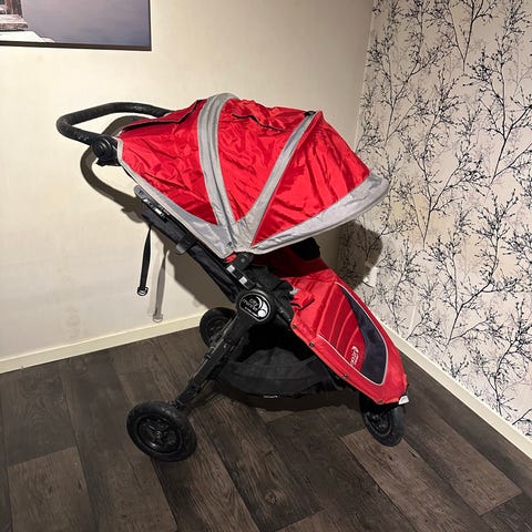 Baby Jogger City Mini dubbelvagn i röd färg. Syskonvagn med två sittdelar bredvid varandra, individuellt justerbara ryggstöd och separata suffletter. Vagnen har två hjul framtill och två bakhjul med parkeringsbroms, samt varukorg under sittdelarna. Passar för två barn som sitter upp och kan användas i vardagen, på promenader och vid resor där en kompakt och smidig dubbelvagn behövs.