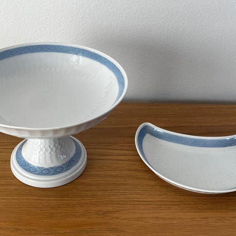 Bruka Design tårtfat i keramik i blått med vit kant. Fatet står på en konformad fot och har cirkelformat mönster på ovansidan. Passar för servering av tårta, kakor eller andra bakverk.
