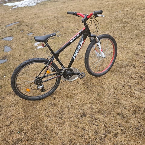Scott mountainbike för unisex med ramstorlek M och 26" hjul. Cykeln har framgaffel med dämpning, grovmönstrade däck och skivbromsar. Utrustad med Shimano-växlar fram och bak med flera drev för varierad utväxling. Passar för vardagscykling och enklare terrängkörning. Färgkombination svart och röd med vita detaljer.