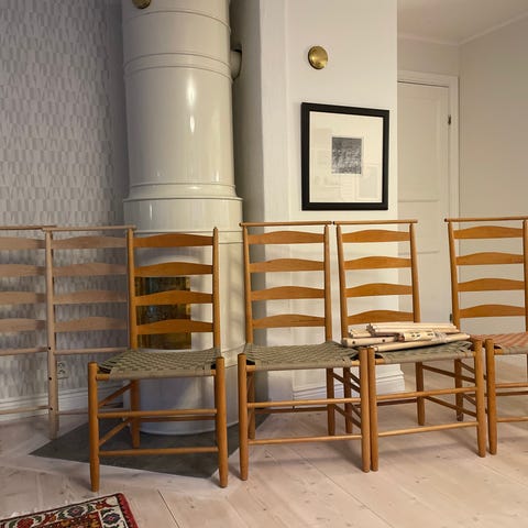 Väldigt lätt böjd skiva på annars utmärkt bord. Två inläggsskivor för att förlänga bordet ytterligare. 8 stolar där 2 är skadade.