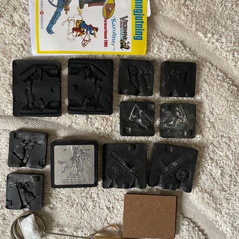 Gammalt set för gjutning av tennsoldater. Två formar samt tenngubbar som kan smältas igen. Klämma som håller igen formarna saknas, finns att köpas. Skickas inte