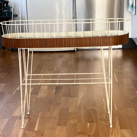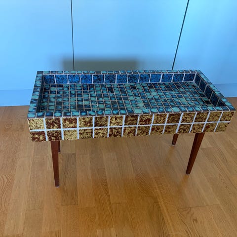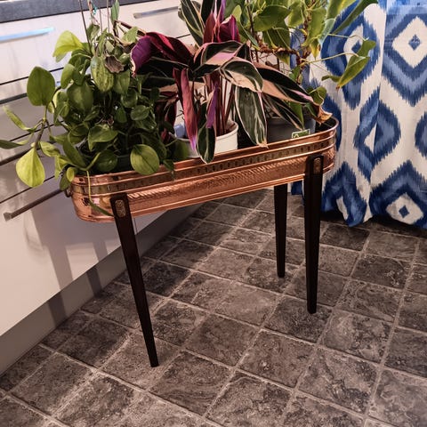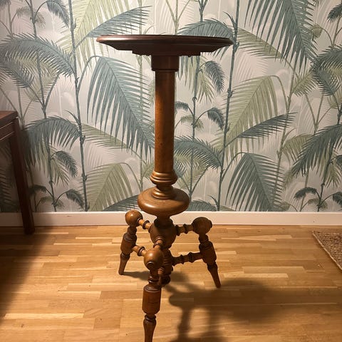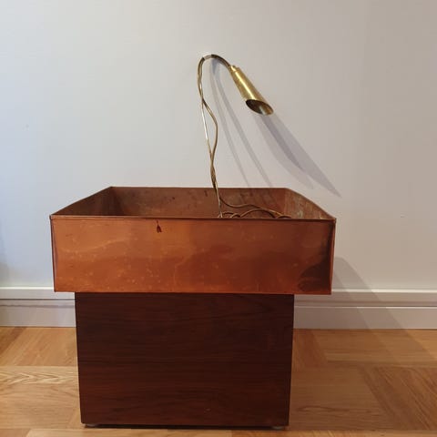 Säljer ett mycket fint blombord i koppar och benställning i brunmålat trä.