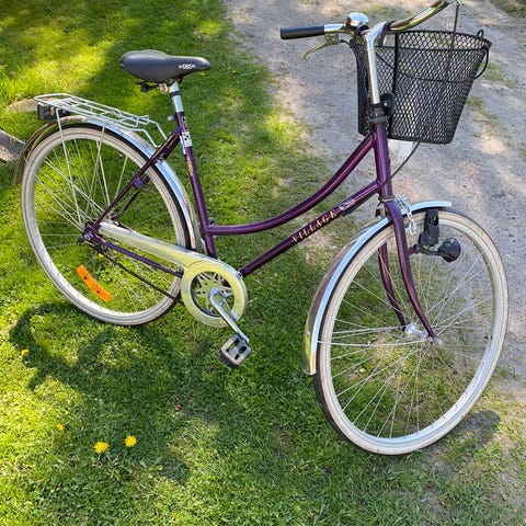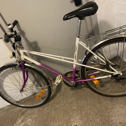 Den oranga cykeln är en cresent, fot o handbroms. 4 växlar, komplett med korg pris 1800kr