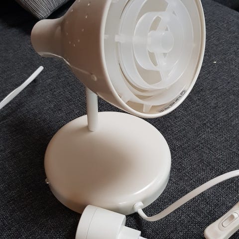 IKEA vägglampa med tre lampor i svart med guldfärgad insida på skärmarna. Lampan är avsedd för montering i tak och har en rektangulär basplatta där armaturen fästs. Varje lampskärm rymmer en glödlampa med E27-sockel (baserat på utseende, kontrollera specifikationer vid behov). Passar för allmän- eller punktbelysning i exempelvis hall, vardagsrum eller sovrum. Strömkabel med stickkontakt ingår enligt bild.
