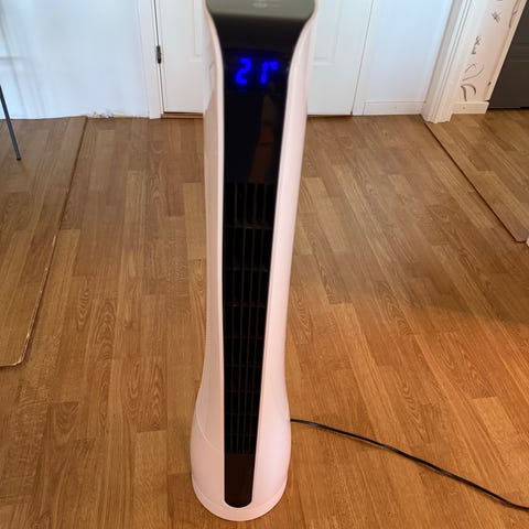 Svart tornfläkt med rund fot och vertikalt galler framtill. Fläkten har manuell ratt upptill för inställning av flera hastighetslägen och avstängning. Lämplig för användning inomhus, till exempel i vardagsrum, sovrum eller kontor för cirkulering av luft.