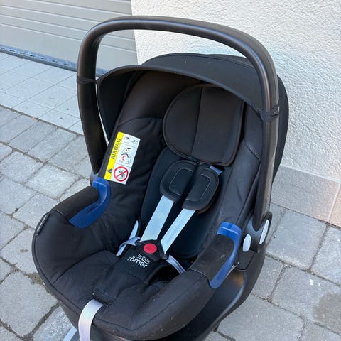 Britax Römer babyskydd för barn 0–13 kg. Modellen är ett bakåtvänt babyskydd i svart tyg med bärhandtag och intern 3- eller 5-punktssele. Passar för användning i bil för spädbarn upp till cirka 13 kg. Extra insats/dyna för mindre barn ingår enligt bild. Monteras i bil med bilens trepunktsbälte eller eventuell bas (bas ingår inte)