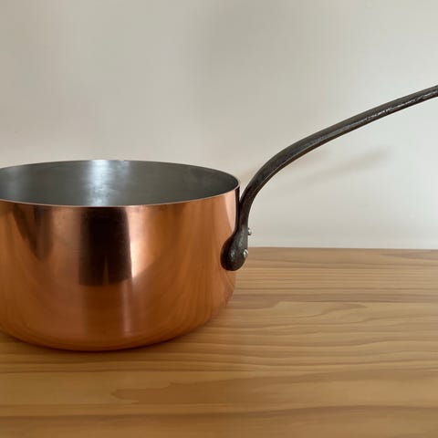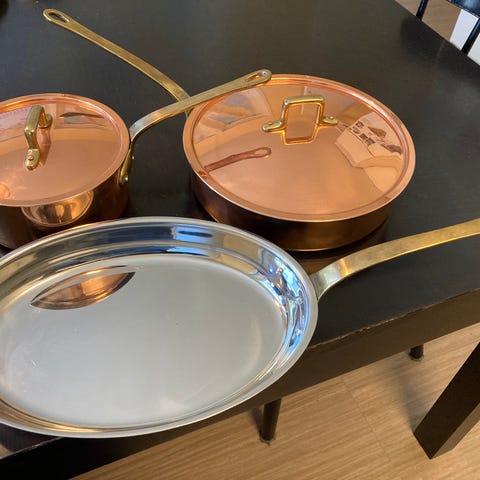 Vi är inte helt säkra på märket men troligtvis Mauviel eller De Buyer. De är inte använda mycket och har mest stått och sett bra ut i köket.