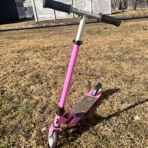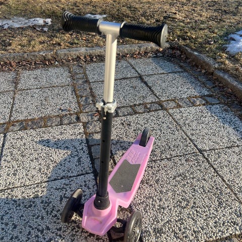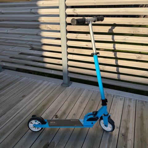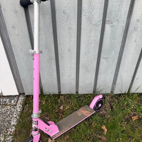 Elsparkcykel i röd färg med två hjul och låg ståplatta. Utrustad med digital display vid styret som visar hastighet eller läge. Framhjulet är större än bakhjulet och det finns inbyggt stöd för att kunna ställa ifrån sig sparkcykeln. Passar för kortare transporter på jämna underlag. Strömbrytare sitter vid displayen på styret.