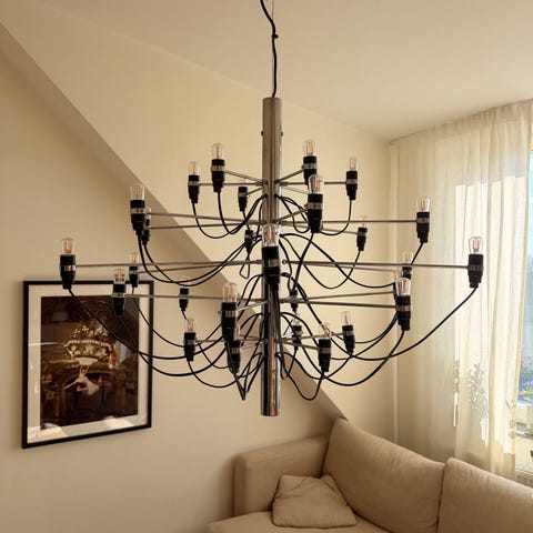 Flos ljuskrona taklampa i kromfärgad metall med 30 glödlampor. Designad av Gino Sarfatti. Lampan har flera armar med socklar för glödlampor och är avsedd för montering i tak. Passar som allmänbelysning i exempelvis vardagsrum, matsal eller större rum där man önskar många ljuspunkter. Sladdar och armatur är samlade kring ett centralt upphäng i taket. En av armarna bör gängas om. Butikspris idag ca 21 000 kr.