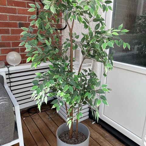 Krukväxt av typen fikus benjamin i större storlek. Växten står i en rund lerkruka med fat på hjul, vilket underlättar förflyttning.