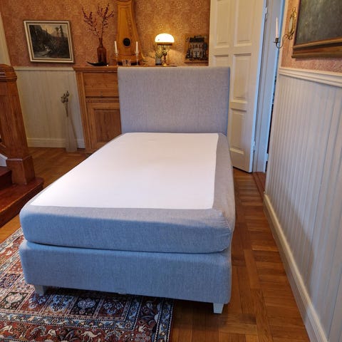 1 år gammal säng som köptes på Kungsängen i Häggvik. Väldigt fint skick. Finns dock en liten liten reva på sidan av sängens madrass, går enkelt att laga.