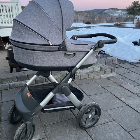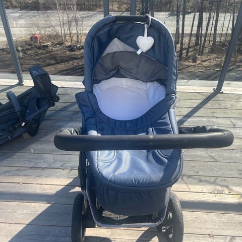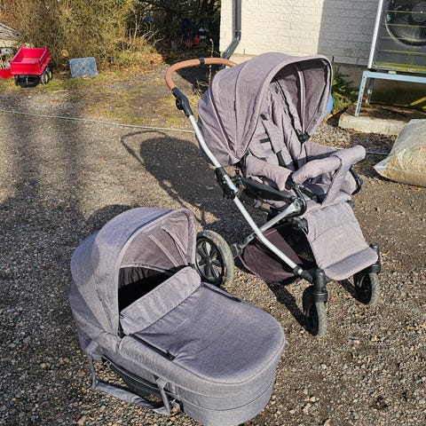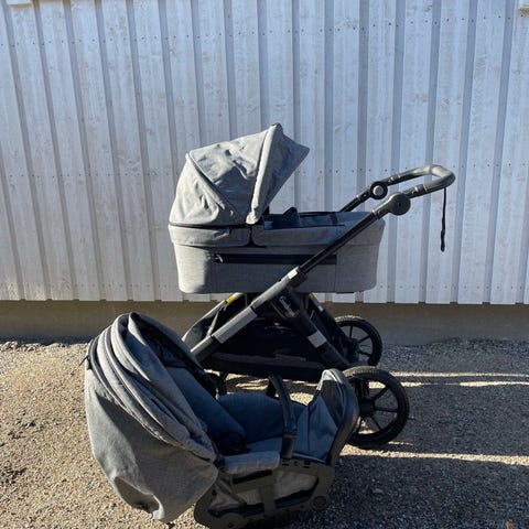 Britax barnvagn med både sittdel och liggdel i grått tyg. Vagnen har varukorg undertill, justerbart handtag och vi har köpt till punkteringsfria däck. Sittdelen är utrustad med sele och bygel framtill. Suffletter med inbyggt myggnät. Stabil och mångsidig vagn som vi tyckt mycket om, men som nu kan tjäna en ny familj. Sliten men det är bra kvalitet. Se bilder på de mest slitna ställena.