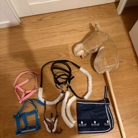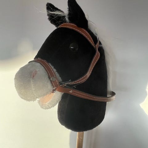 Käpphäst i brun plysch från Hööks. Hästen har svart man och vit bläs samt träpinne som handtag. Medföljer grimma i blått och gult med kedja samt matchande grimskaft i blått och gult. Lämplig som leksak eller för hoppning.