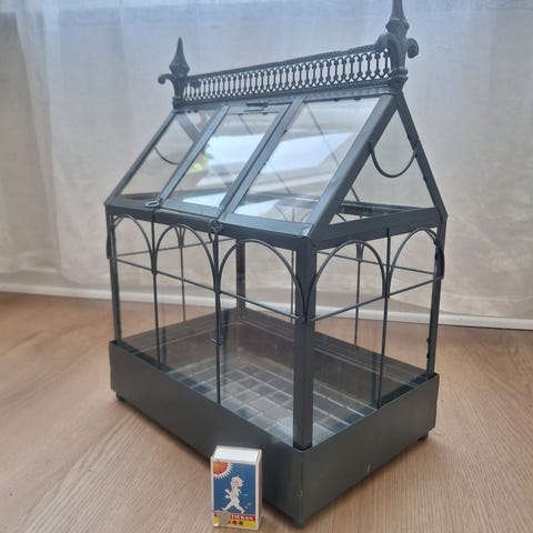 Säljer ett charmigt minidrivhus perfekt för sticklingar, örter eller som en snygg inredningsdetalj. Drivhuset har en bas i zink-look och väggar/tak i glas.