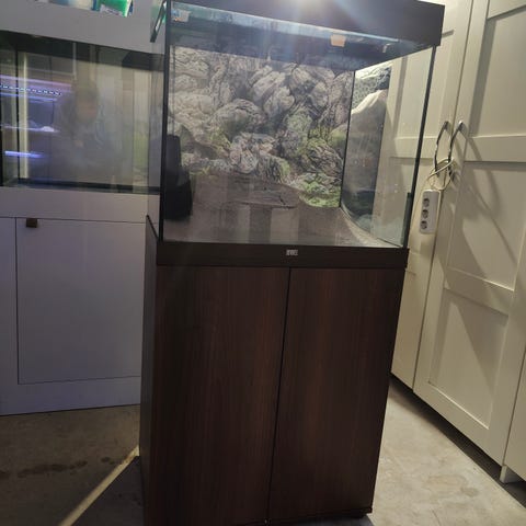 Juwel 120 liters akvarium med tillhörande underskåp i grå färg. Bb Akvariet är komplett med led-belysning, automatisk matare och pump. Diverse tillbehör medföljer. Står på ett matchande skåp som ger förvaring för tillbehör som pumpar, filter och annan utrustning.
