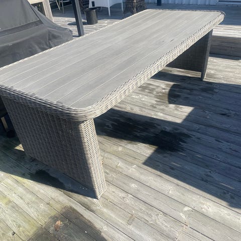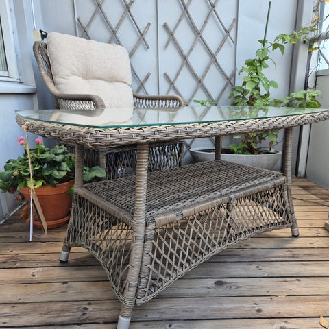 Brafab matbord i konstrotting med rektangulär glasbordsskiva. Bordet har flätad stomme i ljus konstrotting och en plan, genomskinlig glasskiva ovanpå. Passar för användning på altan, balkong eller uteplats som matbord eller avlastningsbord. Stabil konstruktion med fyra ben och bågformad förstärkning mellan benen.