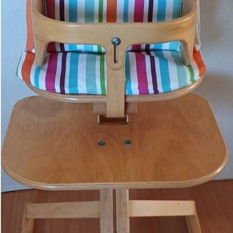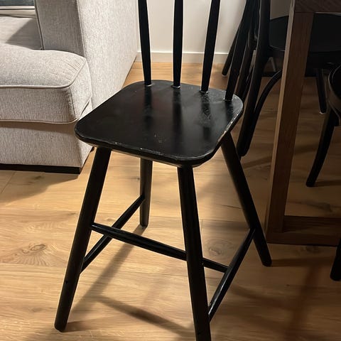 IKEA juniorstol i trä. Stabil stol med ryggstöd i kryssdesign och fotstöd nedtill. Träytan kan torkas av med fuktig trasa vid behov.