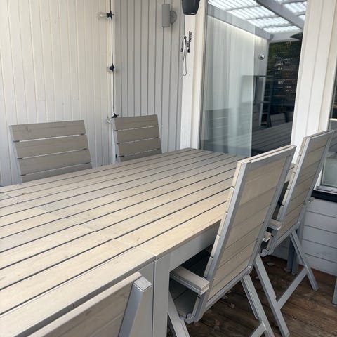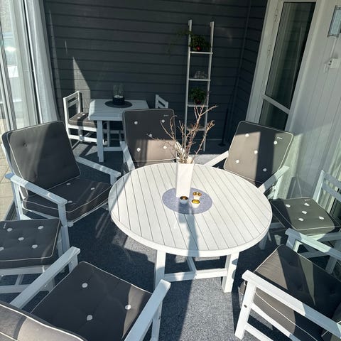 Matgrupp utomhus, ovalt bord och stolar i vitt trä