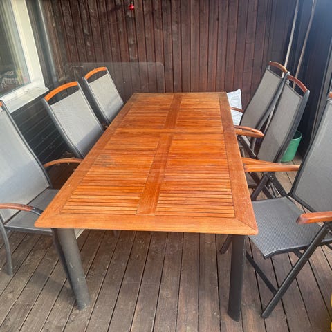 Fin matgrupp från Hillerstorp för utomhusbruk med ovalt förlängningsbart bord och 7 stolar i vitmålat solid trä.