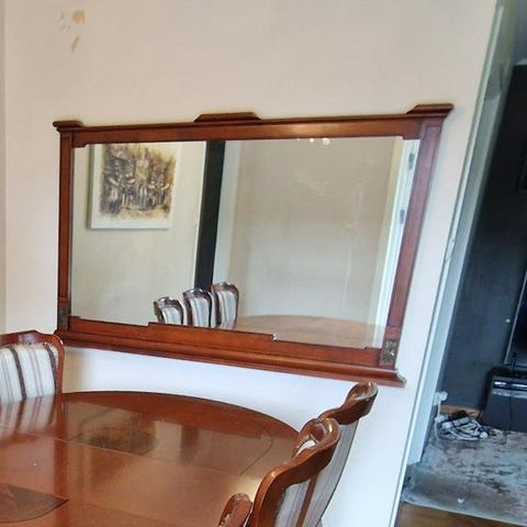 Väggspegel med mörk träram och avfasade hörn upptill. 116 x 45 cm. Bra skick.