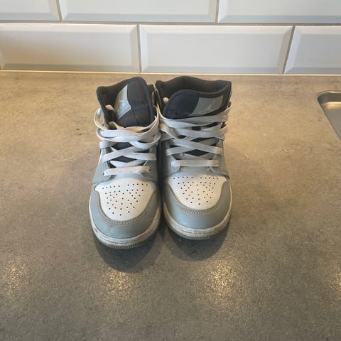 Nike sneakers för barn, unisex, i storlek 36. Skorna är höga med snörning och har ovandel i syntet/materialmix i grått och vitt med blå detaljer. Yttersula i gummi med mönstrad undersida för grepp. Passar till vardagsbruk och fritidsaktiviteter.