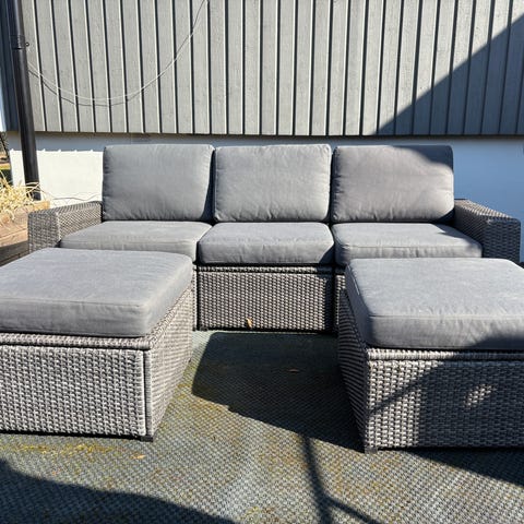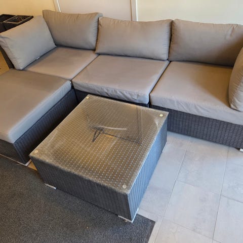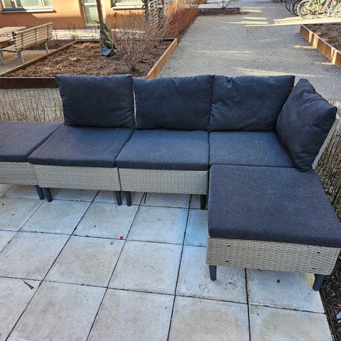 Nytt loungeset bestående av 5 delar. 4 av delarna har ryggstöd och den 5:e kan användas både som pall (med dyna) eller som bord (glasskiva ingår).